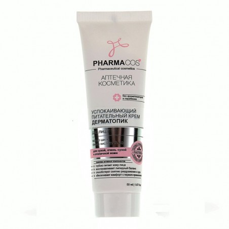 Дерматопик успокаивающий питательный крем для лица PHARMACos Аптечная косметика Витекс глубоко питает кожу, способствует регенерации тканей, повышает увлажненность и эластичность кожи, не допуская развитие кератозов (огрубения эпидермиса). Крем оказывает ярко выраженное успокаивающее действие, снимает раздражение и покраснение, смягчая кожу. Масло ши (Butyrospermum parkii) устраняет ощущение сухости и шелушения кожи, насыщает ее необходимыми полезными веществами, обладает противовоспалительным и антиоксидантным действием. Омега кислоты 3-6-9 восстанавливают кожный барьер, делают кожу более эластичной, улучшают упругость. Уникальный комплекс Phytotal AI уменьшает покраснения и пощипывания, успокаивает зуд и повышает сопротивляемость кожи к внешним факторам. Аллантоин оказывает смягчающее и увлажняющее действие, снимает раздражение и воспаление, успокаивает кожу.
