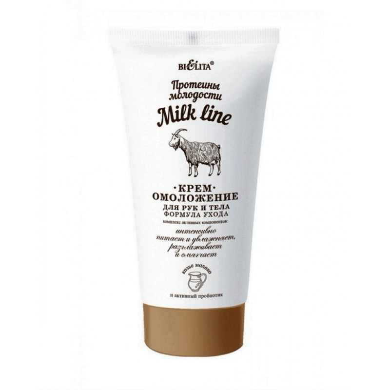 Крем для рук Milk line Протеины молодости Формула ухода Белита обладает невероятно нежной шелковистой текстурой, быстро впитывается, не оставляя чувства сухости и стянутости. Протеины козьего молока в комплексе с активным пробиотиком, омолаживают, питают и смягчают кожу рук и тела, делая ее нежной и шелковистой. TONISKIN стимулирует синтез коллагена, разглаживает микрорельеф кожи. Комплекс витаминов A, C, E, F обладает высокой антиоксидантной активностью, улучшает клеточную регенерацию, благодаря чему кожа быстрее обновляется и выглядит моложе. Масло кокоса питает кожу рук и тела, придает ей упругость и эластичность.