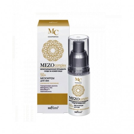 Мезокрем для век Комплексное омоложение Белита Mezocomplex восстанавливает оптимальный уровень увлажненности кожи век, усиливает микроциркуляцию, уменьшает припухлости и темные круги под глазами, подтягивает кожу век и разглаживает морщины вокруг глаз. Matrigenics.14G активирует 14 генов, участвующих в синтезе коллагена, эластина и гиалуроновой кислоты, уменьшает морщины через 14 дней ежедневного применения.Beautifey подтягивает кожу век, разглаживает морщины вокруг глаз, уменьшает припухлости и темные круги под глазами. Гиалуроновая кислота направленного действия проникает в глубокие слои эпидермиса, обеспечивает видимый эффект разглаживания морщин путем выталкивания их изнутри, оказывая действие подобное салонной процедуре мезотерапии. Коктейль из аминокислот (таурин, глицин, аргинин) наполняет клетки кожи энергией и жизненной силой, способствует клеточной регенерации.