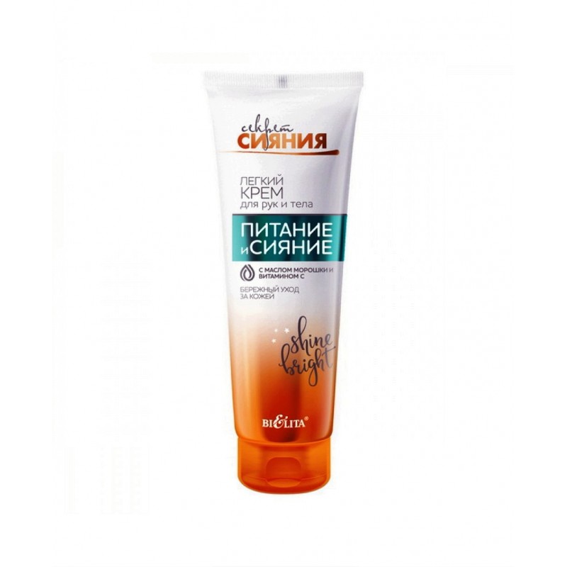 Легкий крем для рук и тела Секрет сияния Белита - бережный уход за вашей кожей. Комплекс активных компонентов, входящий в состав крема, воздействует на кожу по нескольким направлениям: питает кожу, придавая ей гладкость, нежность и эластичность великолепно увлажняет кожу, придавая естественное сияние защищает от агрессивных факторов окружающей среды. Масло лесного ореха обладает великолепными увлажняющими и смягчающими свойствами, восстанавливает кожу, делая её гладкой, нежной и эластичной.