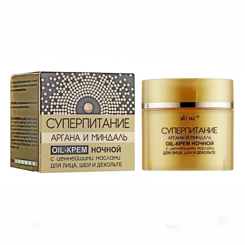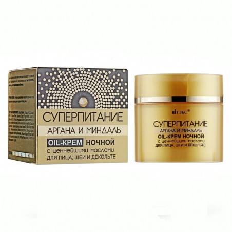 Ночной крем Суперпитание Аргана и миндаль Витекс для лица шеи и декольте обеспечивает коже абсолютное питание обновляет и восстанавливает структуру кожи, делает кожу мягкой и бархатистой, мгновенно тает на коже, превращаясь из крема в масло. Роскошный крем с бархатистой насыщенной структурой максимально насыщен маслами арганы и сладкого миндаля, поэтому является идеальным средством ухода за кожей в ночное время. Комплекс искусно подобранных натуральных масел активно насыщает клетки эпидермиса питательными веществами, восстанавливает природный защитный барьер кожи, укрепляет и подтягивает овал лица. Способствует активизации процессов самовосстановления кожи, снимает все следы усталости. Морщинки разглаживаются, кожа становится более упругой и мягкой, она сияет молодостью и красотой.
