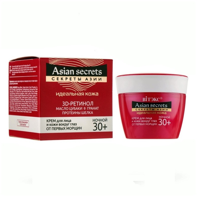 Крем против первых морщин Секреты Азии Витекс стимулирует процессы восстановления и омоложения пока вы спите. Устраняя следы дневного стресса, крем усиливает эластичность кожи и наполняет ее энергией для эффективной борьбы с морщинами и преждевременным старением. 3D-РЕТИНОЛ - 3 активные формы ретинола, действующие сразу по нескольким направлениям: LPD's Vitamin A - инкапсулированный ретинол - обладает высокой проникающей способностью, сохраняет свою эффективность на протяжении длительного времени и начинает действовать непосредственно при нанесении на кожу: укрепляет волокна коллагена и предупреждает их разрушение, повышает упругость кожи и на 33% разглаживает морщины. Vit-A-Like стимулирует синтез коллагена, ускоряет процессы клеточного обновления, сокращает морщины, выравнивает тон кожи. Vitamin A восстанавливает защитные функции кожи, борется со свободными радикалами, защищая от преждевременного старения. МАСЛО ЦУБАКИ древний азиатский секрет красоты - богато витаминами А, В и Е, ненасыщенными жирами, коллагеном и антиоксидантами, проникает в глубокие слои кожи, активно питает и увлажняет кожу, восстанавливает эпидермальный барьер кожи, предупреждая появление морщин и повышая тонус кожи, на 25% замедляет преждевременное старение кожи. ПРОТЕИНЫ ШЕЛКА выравнивают микрорельеф, глубоко увлажняют и улучшают эластичность кожи, возвращают ей шелковистую мягкость и гладкость. ГРАНАТ мощное омолаживающее средство надежно защищает кожу от свободных радикалов, сохраняя ее молодость и здоровье, предотвращает обезвоживание, выравнивает текстуру кожи, улучшает цвет лица.