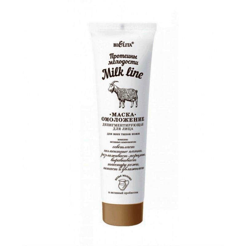 Депигментирующая маска для лица Milk line Протеины молодости Белита содержит целебное козье молоко и активный пробиотик, идеально ухаживает за кожей, разглаживает морщины, осветляет участки гиперпигментации и заметно «оживляет» цвет лица. Протеины козьего молока в комплексе с активным пробиотиком омолаживают, увлажняют и смягчают кожу, делая ее нежной и шелковистой. TONISKIN стимулирует синтез коллагена, разглаживает морщины и выравнивает цвет лица. Комплекс витаминов A,C,E,F обладает высокой антиоксидантной активностью, улучшает клеточную регенерацию кожи, благодаря чему кожа быстрее обновляется и выглядит моложе. Экстракты толокнянки и имбиря обладают природными отбеливающими свойствами, действуют на пигментированные участки, осветляя их и придавая коже ровный, сияющий тон. Масло кокоса мгновенно восстанавливает и питает кожу.