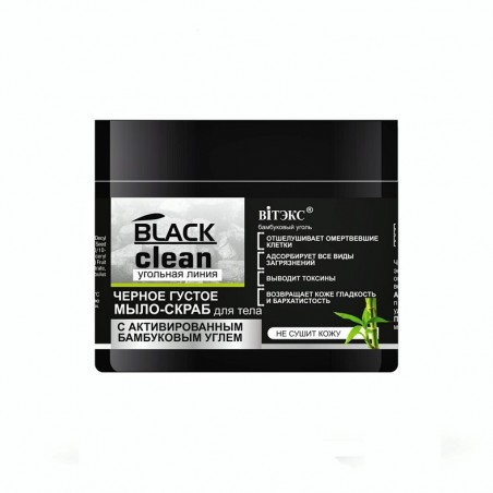 Мыло с активированным бамбуковым углем Black Clean Витекс отшелушивает омертвевшие клетки, адсорбирует все виды загрязнений, выводит токсины, возвращает коже гладкость и бархатистость. Черное густое мыло-скраб для тела с активированным углем эффективно адсорбирует все виды загрязнений, бережно отшелушивая омертвевшие клетки кожи. Деликатно очищает кожу, не пересушивая ее, возвращая ей гладкость и бархатистость.