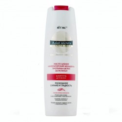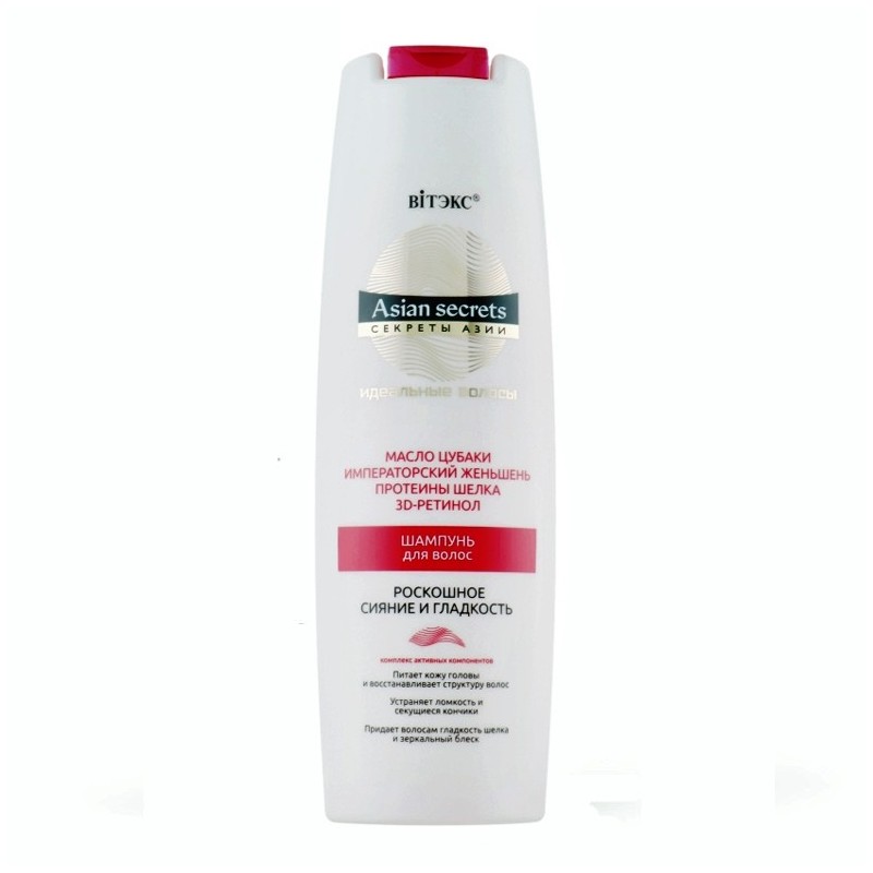 Шампунь Секреты Азии Витекс Роскошное сияние и гладкость питает кожу головы и восстанавливает структуру волос, устраняет ломкость и секущиеся кончики, придает волосам гладкость шелка и зеркальный блеск. Шампунь содержит компоненты, которые ухаживают за кожей головы и восстанавливают волосы, придают им удивительную гладкость, зеркальный блеск, эластичность и упругость. Комплекс активных компонентов превосходно питает кожу головы, усиливает микроциркуляцию, уплотняет и разглаживает структуру волос, защищает от повреждений и сухости, предупреждая появление секущихся кончиков, ломкости и ослабления волос, укрепляет волосяные фолликулы и способствует росту здоровых, сильных и густых волос. При регулярном применении волосы наполняются силой, обретают атласную гладкость, становятся блестящими и шелковистыми. МАСЛО ЦУБАКИ - древний азиатский секрет красоты - богато витаминами A, В и Е, ненасыщенными жирами, коллагеном и антиоксидантами, превосходно питает кожу головы и восстанавливает структуру волос, насыщая их жизненной силой и возвращая природную красоту и здоровье. Масло не только восстанавливает естественный блеск волос, но и усиливает его благодаря способности мгновенно впитываться, питает волосы изнутри, предупреждая их ломкость и истончение. ИМПЕРАТОРСКИЙ ЖЕНЬШЕНЬ питает кожу головы, защищая ее от сухости и шелушения, усиливает микроциркуляцию, укрепляет волосяные фоликуллы и способствует росту здоровых, сильных и густых волос. ПРОТЕИНЫ ШЕЛКА укрепляют и разглаживают структуру волос, защищают ее от повреждений, предупреждая появление секущихся кончиков, ломкости и ослабления волос, повышают их упругость и эластичность, наполняют волосы блеском. 3D-РЕТИНОЛ (Витамин А) стимулирует выработку кератина - главного «строительного» белка волос, делает волосы эластичными, упругими и прочными. Подходит для всех типов волос.