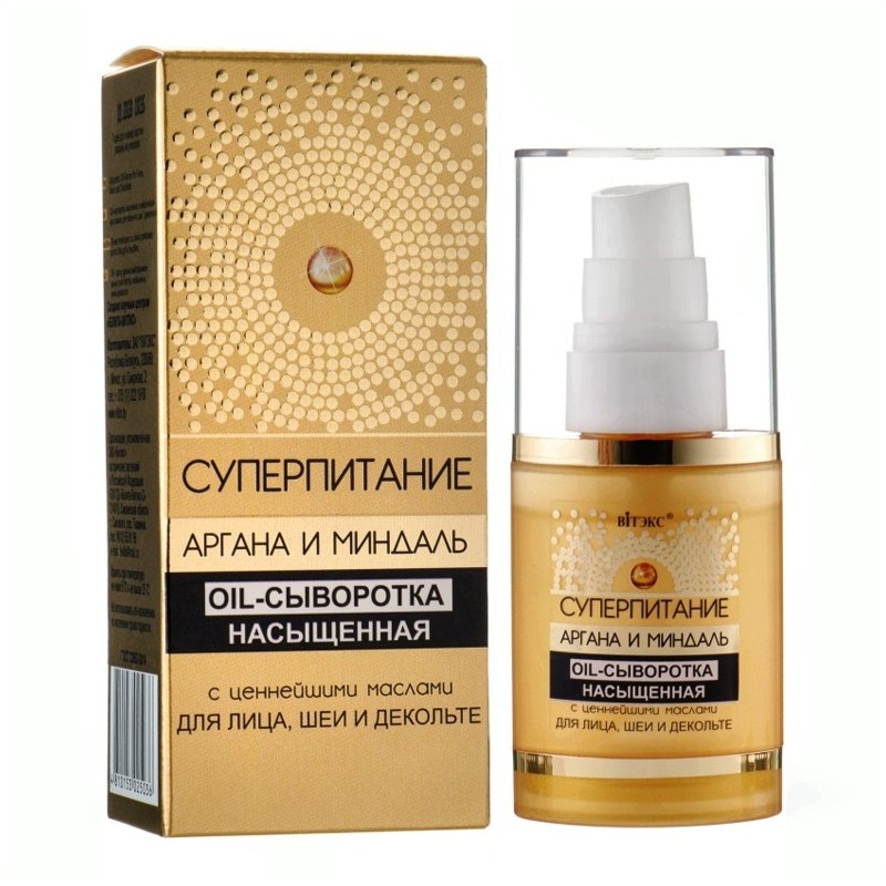 Сыворотка с драгоценными маслами Витекс Суперпитание Аргана и миндаль нежной, тонкой текстуры разработана по новейшей технологии с высоким содержанием масел арганы и сладкого миндаля, сходных со структурными элементами липидных слоев эпидермиса. Активный oil - комплекс полноценно питает, смягчает, увлажняет, разглаживает и восстанавливает кожу. Значительно корректирует глубину морщин и предотвращает их появление. Питательные вещества и протеины, которые содержатся в натуральных маслах арганы и сладкого миндаля, помогают сохранить упругость и эластичность кожи и стимулируют регенерацию новых клеток. Кожа преображается - приобретает необыкновенную мягкость и шелковую гладкость. Рекомендуется использовать сыворотку для косметического массажа.