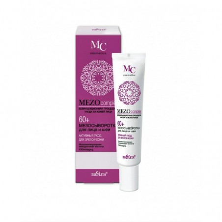 Мезосыворотка для лица и шеи Активный уход для зрелой кожи 60+ Белита Mezocomplex - концентрированное средство интенсивного действия, специально разработанное для ухода за зрелой кожей. Оказывает видимый эффект подтягивания, эффективно разглаживает морщины, повышает тургор и плотность кожи, обеспечивает интенсивное увлажнение на 24 часа. Низкомолекулярная гиалуроновая кислота благодаря своему малому размеру глубоко проникает в кожу и активно воздействует на кожу изнутри: способствует синтезу коллагена и эластина, стимулирует выработку собственной гиалуроновой кислоты, оказывает эффект мгновенного лифтинга, уменьшает глубину морщин. Высокомолекулярная гиалуроновая кислота эффективно увлажняет верхние слои кожи, создает оптимальные условия для проникновения активных компонентов сыворотки в глубокие слои, повышает тургор и плотность кожи, уменьшает выраженность морщин и складок. X50Antiaging – «умный» пептид, точно определяющий возрастные изменения кожи – стимулирует клетки кожи к обновлению и омоложению, эффективно разглаживает морщины, увеличивает синтез коллагена и эластина. Tens’UpTM – обеспечивает видимый эффект подтягивания, оказывает длительное антивозрастное действие на кожу за счет улучшения синтеза коллагена.