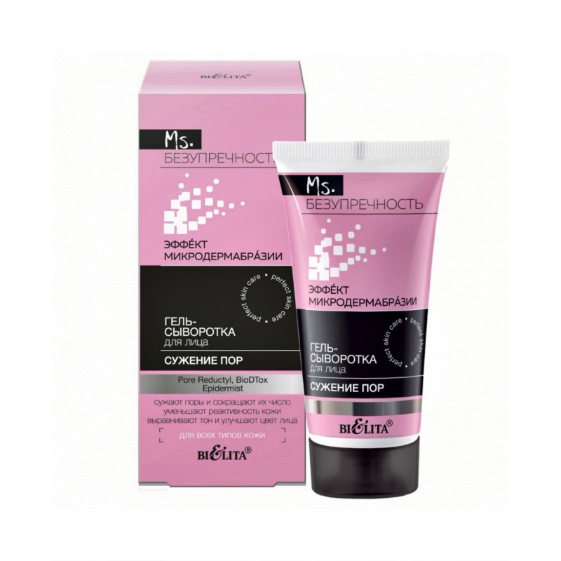 Сыворотка для сужения пор Ms Безупречность Эффект Микродермабразии Белита, благодаря активным компонентам (Pore Reductyl, BioDTox, Epidermist, Aquaxy) повышает эластичность кожи и заметно сужает поры, нормализует гидролипидный баланс, восполняя дефицит влаги, предупреждает появление «черных» точек, сглаживает неровности и снижает реактивность кожи, полученные в результате влияния городского стресса.