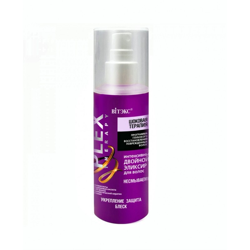 Эликсир для волос Plex therapy Шоковая терапия Витекс Интенсивный двойной несмываемый эликсир разглаживает поверхность волос и усиливает блеск, облегчает расчесывание, уменьшая возможность повреждений, предупреждает появление секущихся кончиков, создает невесомый защитный слой. Несмываемый двойной эликсир – экспресс средство для укрепления и мгновенного придания волосам дополнительного блеска, обеспечивает надежную защиту от термических и механических повреждений, облегчает расчесывание. Уникальная двухфазная формула эликсира питает и увлажняет волосы по всей длине, разглаживает кутикулу, уменьшает ломкость, предупреждает появление секущихся кончиков и непослушных торчащих завитков. Не утяжеляет волосы. Подходит как для самостоятельного использования, так и в качестве несмываемого финиш-средства после использования процедур программы PLEX THERAPY.