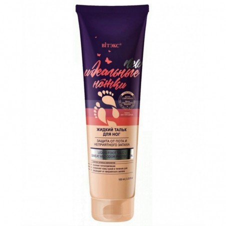 Жидкий тальк для ног Идеальные ножки Витекс при нанесении на кожу превращается в воздушный тальк на коже, адсорбируя лишнюю влагу и обеспечивая свежесть и сухость ног в течение всего дня. Специальный комплекс активных компонентов препятствует потоотделению и обеспечивает длительный дезодорирующий эффект, дарит ощущение легкой прохлады и свежести. Масло чайного дерева оказывает антимикробное и бактерицидное действие. Фарнезол способствует уничтожению бактерий, вызывающих неприятный запах пота. Жидкий тальк быстро впитывается, оставляя на коже ощущение шелковистости и бархатистости.