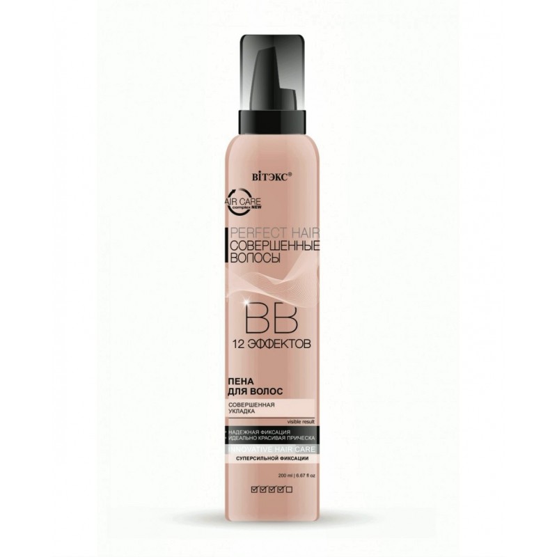 Пена для волос суперсильной фиксации Perfect Hair Совершенные волосы Витекс не только фиксирует прическу, но и одновременно ухаживает за волосами. Специальные активные компоненты, входящие в состав пены, позволяют получить сразу 12 эффектов: Надежная эластичная фиксация, Многомерный дополнительный объем, Зеркальный блеск, Защита от ломкости и сухости, Укрепление и визуальное утолщение волос, Восстановление и разглаживание структуры, Устранение эффекта «непослушных» волос, Повышение эластичности и прочности, Термозащита, Без утяжеления, Без эффекта склеивания, Легкое удаление при расчесывании.